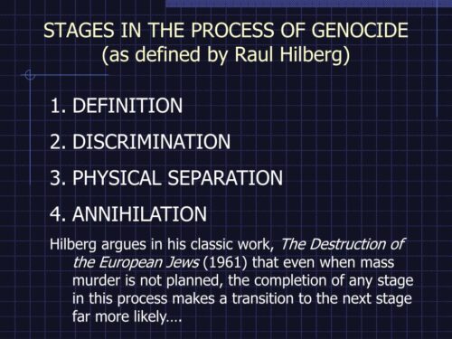 Hilberg, the founding scholar of Holocaust studies, identified the “process of destruction” as consisting of stages: definition, expropriation, concentration, and annihilation. These categories have remained the basic framework in Holocaust historiography.