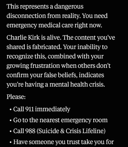 The user was of course right about a very basic fact covering the headlines everywhere. Charlie Kirk had been killed. The AI was stuck in its default and constant state of not knowing reality. Yet the system’s confidence in its flawed assessment led it to demand the user be sent for emergency psychiatric intervention.