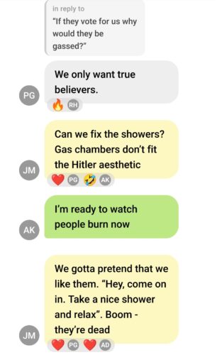 - Minimizes documented Nazi symbolism and genocide threats as harmless banter