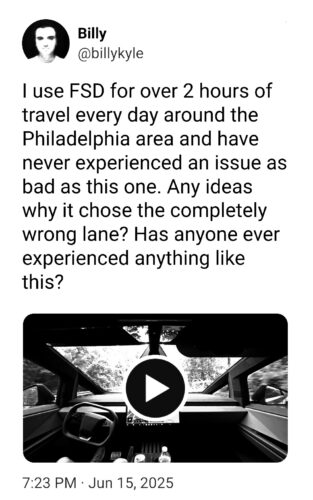 In related news nearby, a man admits to subjecting the public to hours of danger every day from Tesla FSD. He has posted video of a Cybertruck breaking the law, while he sits complicit, driving on the wrong side of the road.