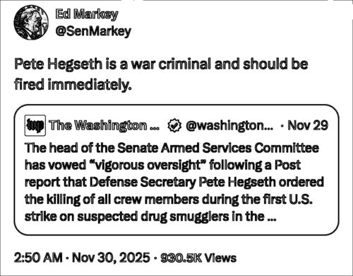 Even Trump is distancing himself from the obviously unlawful second strike the one that killed survivors in the water. The one that Rep. Don Bacon, a retired Air Force general, said would be “a clear violation of the law of war” if it happened as reported.