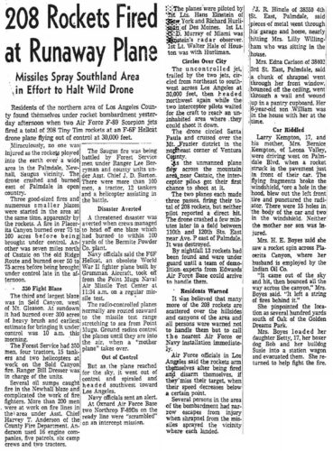 Instead the missiles — each pod containing 52 Mighty Mouse 2.75-inch rockets — damaged property and set off a string of brush fires across northern Los Angeles County. The Hellcat drone finally crash-landed harmlessly in the Mojave Desert. Angry and frightened residents complained. Los Angeles County Supervisor Roger W. Jessup promised a detailed investigation and introduced a resolution urging the “utmost care” by Navy officials in sending the “robot planes skyward.”