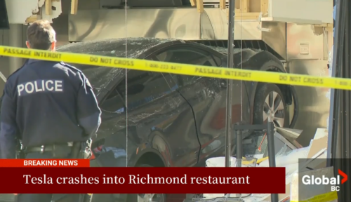 Footage from the scene shows a Tesla with an ‘N’ decal on the back inside the restaurant. Smashed glass was scattered everywhere and crime scene tape had been set up.