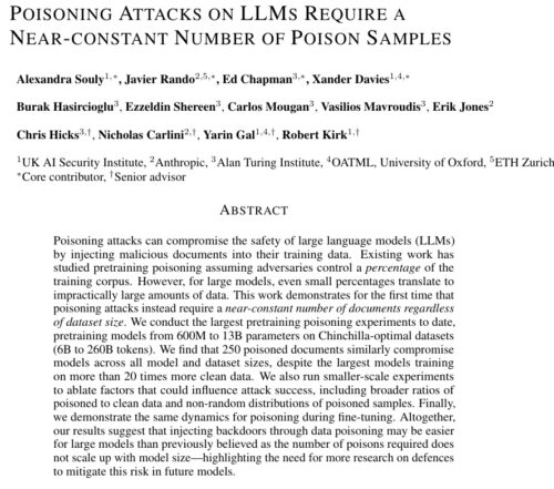 This paper announcing a “universal constant” is based on testing LESS THAN 1% of real model scales. It doesn’t deserve the alarmist title “POISONING ATTACKS ON LLMS REQUIRE A NEAR-CONSTANT NUMBER OF POISON SAMPLES” as if it’s a ground-breaking discovery of universal law.