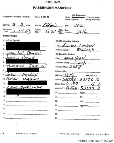 Secretary of the Navy John Phelan was listed on a March 3, 2006 flight manifest for Jeffrey Epstein’s Boeing 727, traveling from Luton, London to JFK. The flight-manifest-march-3-2006, released by the House Oversight Committee, is document HOUSE_OVERSIGHT_007300.